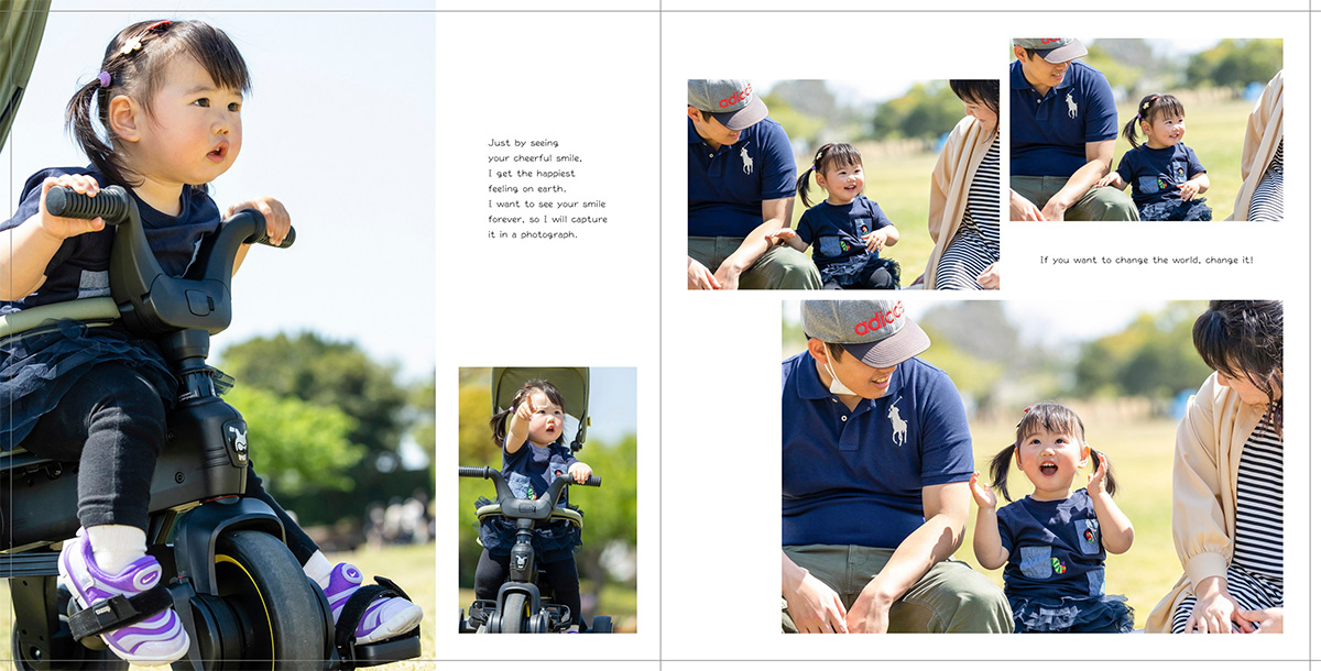 見開きに切れ目がないので、横長のダイナミックなデザインができるのも特徴です。
